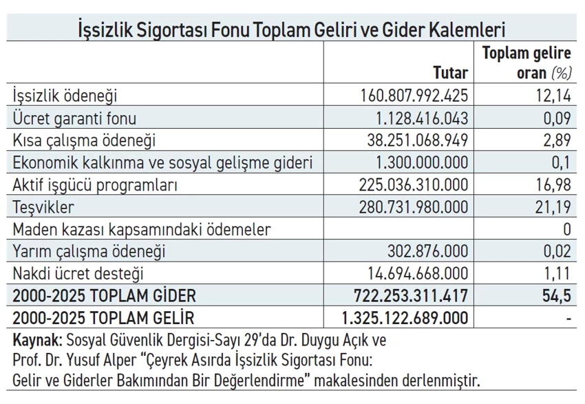 SGK tarafından yayınlanan yarı akademik Sosyal Güvenlik Dergisinin 29. Sayısında yayımlanan Çeyrek Asırda İşsizlik Sigortası Fonu: Gelir ve Giderler Bakımından Bir Değerlendirme başlıklı Yozgat Bozok Üniversitesi Öğretim Görevlisi Duygu Açık ve Bursa Uludağ Üniversitesi Öğretim Üyesi Yusuf Alper makalesinde, fonun 2000’den bu yana gelir ve giderleri derlendi. Buna göre, fon başlangıcından Ekim 2025 sonuna kadar 1 trilyon 325 milyar 122.6 milyon TL gelir elde etti. Bu gelirin 722 milyar 253.3 milyon TL’si harcandı.