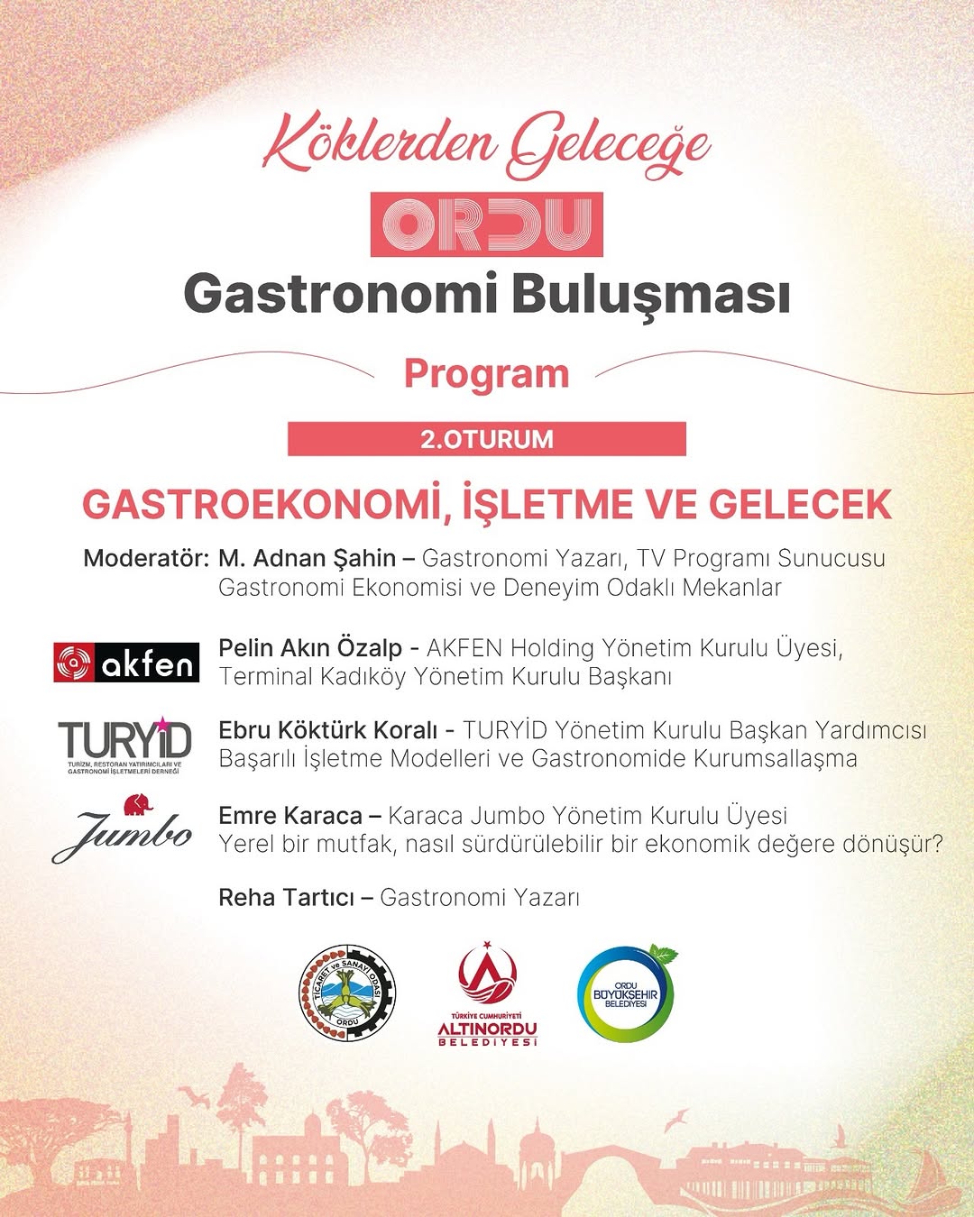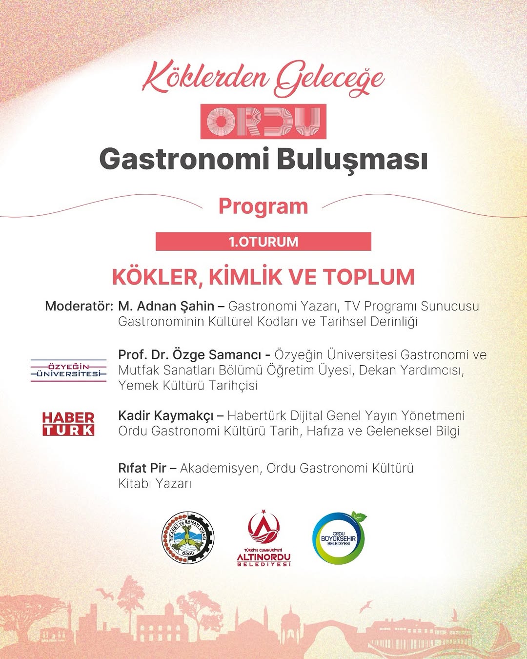 Programın ilk oturumu “Kökler, Kimlik ve Toplum” başlığıyla yapılacak. Moderatörlüğünü gastronomi yazarı ve TV sunucusu M. Adnan Şahin üstlenecek. Oturumda Özyeğin Üniversitesi’nden Prof. Dr. Özge Samancı, Habertürk Dijital Genel Yayın Yönetmeni Kadir Kaymakçı ve akademisyen-yazar Rıfat Pir konuşmacı olarak yer alacak. İkinci oturumda ise gastronomi ekonomisi ve işletme modelleri masaya yatırılacak. Bu bölümde Pelin Akın Özalp (Akfen Holding), Ebru Köktürk Koralı (TURYİD) ve Emre Karaca (Jumbo) konuşacak. Etkinlikte, yerel mutfakların ekonomik değeri, gastronomi turizmi ve deneyim odaklı işletme modelleri tartışılacak. Altınordu Belediyesi yetkilileri, Ordu’nun mutfak kültürünü ve gastronomi potansiyelini keşfetmek isteyen herkesi etkinliğe davet etti. Yer: Taşbaşı Kilisesi Sanat Alanı Tarih: 4 Nisan 2026