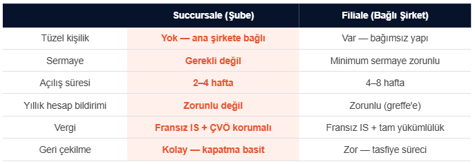 Şube, özellikle başlangıç aşamasında en mantıklı seçim. Pazarı test et, müşteri portföyünü geliştir, ödemeleri güvence altına al — sonra gerekirse filiale’e geç.