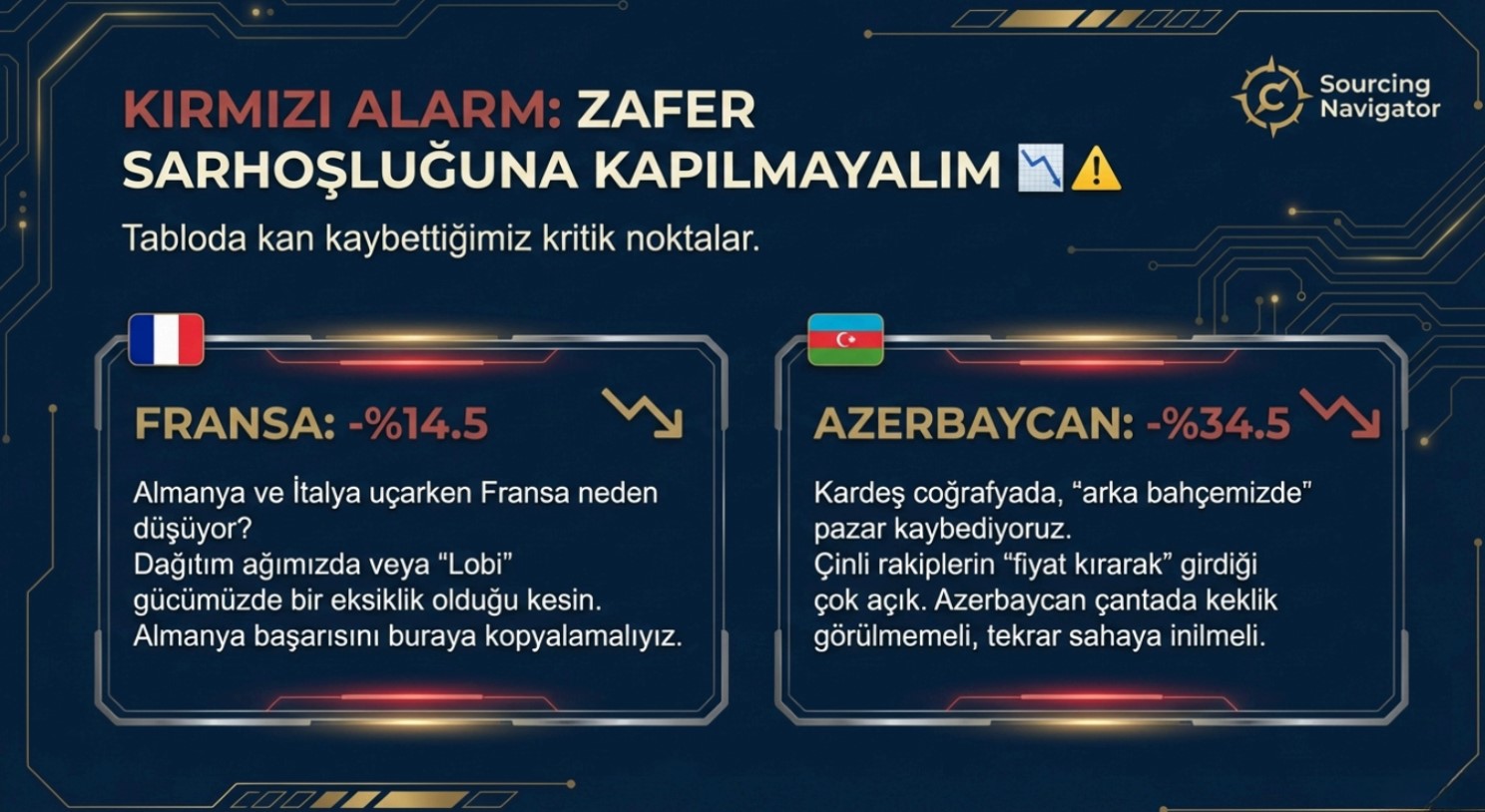 Azerbaycan (-%34.5): Kardeş coğrafyada pazar kaybediyoruz. Çinli rakipler agresif fiyatla içeri girmiş durumda. Burası “çantada keklik” değil; yeniden sahaya inmek şart.
