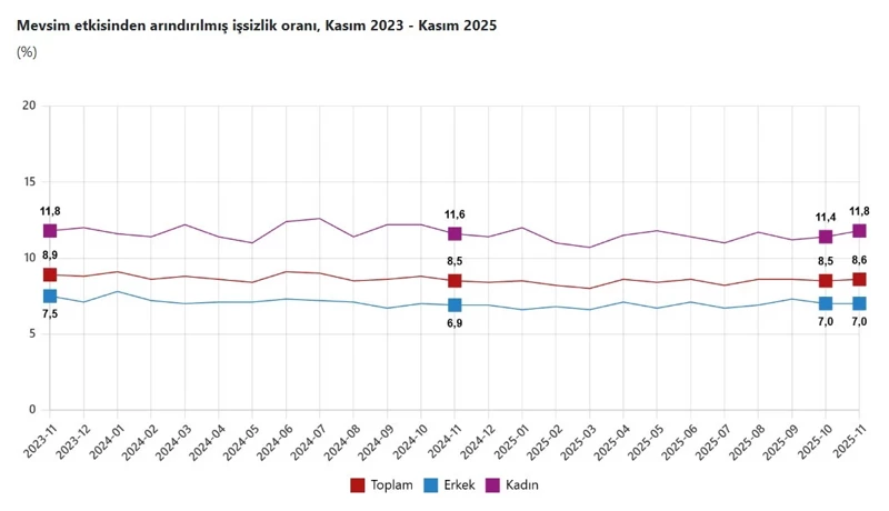Verilere göre, işsizlik oranı ise 0,1 puan artarak yüzde 8,6 seviyesinde gerçekleşti. İşsizlik oranı erkeklerde yüzde 7,0 iken kadınlarda yüzde 11,8 olarak tahmin edildi.