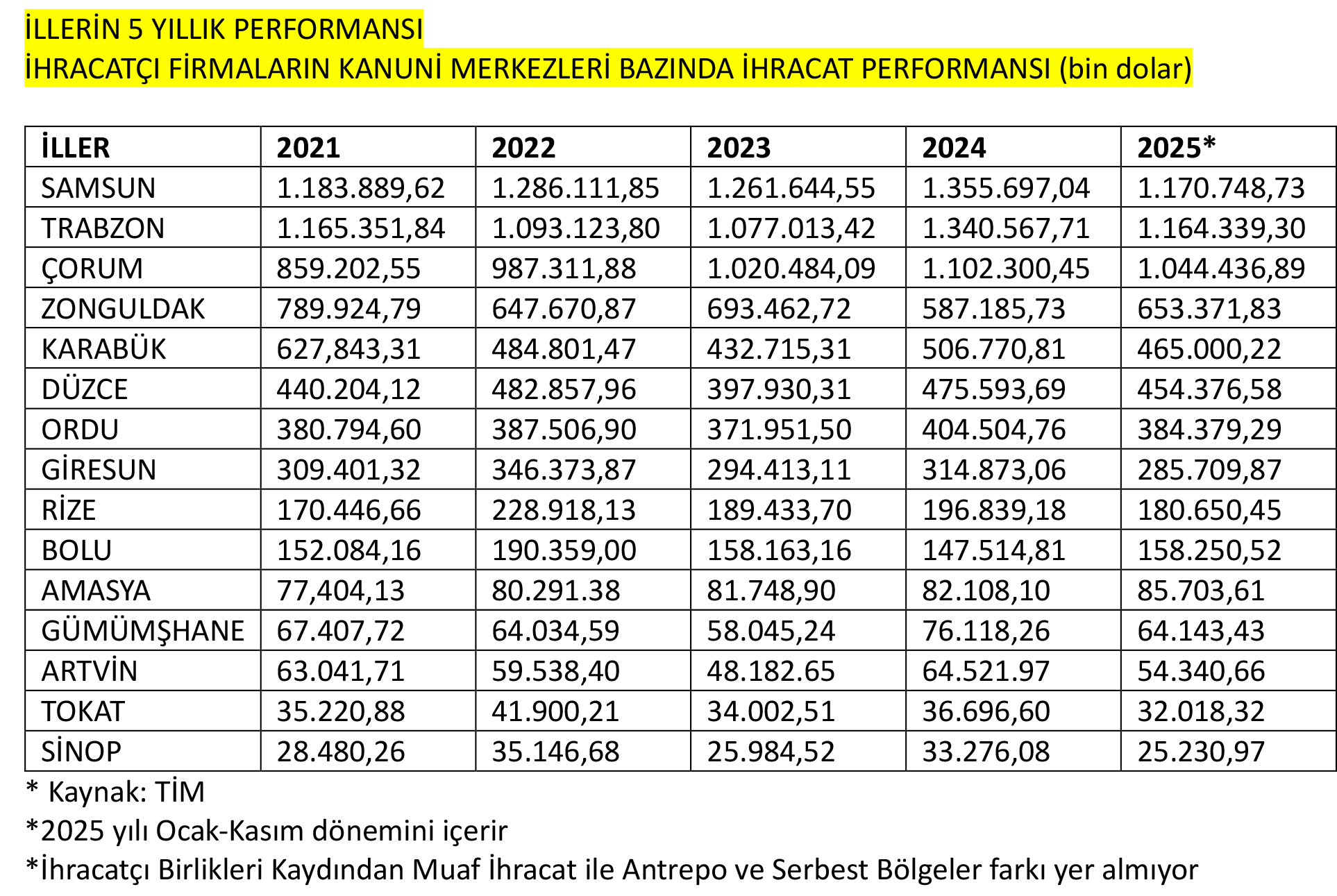 2024 TABLOSU: KARADENİZ’DEN 3 İL 1 MİLYAR DOLAR LİGİNDE