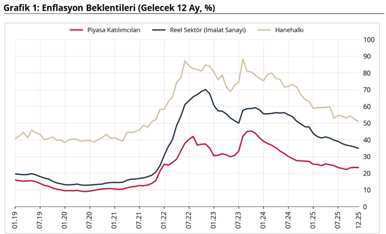 Buna göre, 2025 yılı Aralık ayında 12 ay sonrası yıllık enflasyon beklentileri bir önceki aya göre, piyasa katılımcıları için 0,14 puan azalarak yüzde 23,35 seviyesine, reel sektör için 0,90 puan azalarak yüzde 34,80 seviyesine, hanehalkı için 1,34 puan azalarak yüzde 50,90 seviyesine geriledi.