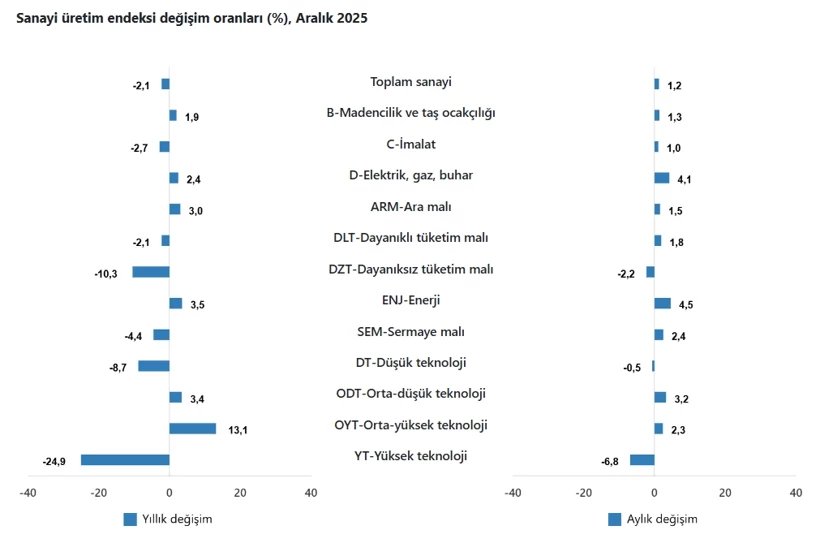 Sanayinin alt sektörleri incelendiğinde, Aralık 2025'te madencilik ve taş ocakçılığı sektörü endeksi bir önceki yılın aynı ayına göre yüzde 1,9, elektrik, gaz, buhar ve iklimlendirme üretimi ve dağıtımı sektörü endeksi yüzde 2,4 artarken imalat sanayi sektörü endeksi yüzde 2,7 azaldı.