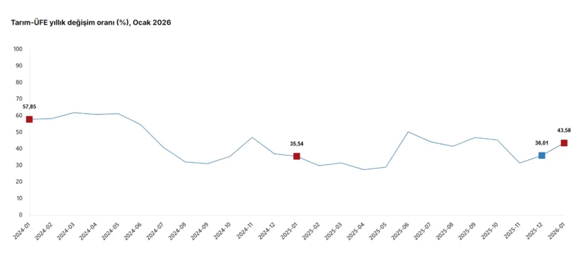 Tarım ürünleri üretici fiyatları 2026 yılı Ocak ayında güçlü artışını sürdürdü. Tarım ÜFE aylık yüzde 8,46, yıllık yüzde 43,58 yükselirken, en sert artış sebze ile meyve gruplarında görüldü.