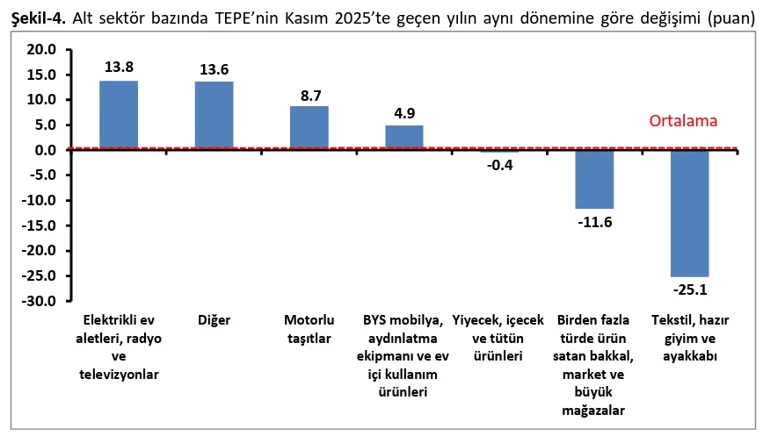 Alt sektörler bazında perakende güveninin en fazla arttığı alan “elektrikli ev aletleri, radyo ve televizyonlar” olurken, tekstil, hazır giyim ve ayakkabı sektörü en zayıf performansı gösterdi.