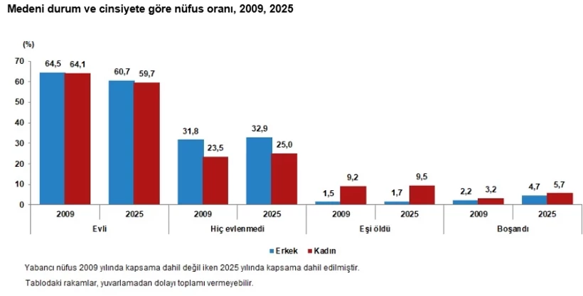 Medeni durum dağılımına bakıldığında, 2009 ve 2024 karşılaştırmasında erkeklerde hiç evlenmeyenlerin oranının kadınlara göre daha yüksek olduğu görüldü. Kadınlarda ise eşi ölen ve boşananların oranı erkeklerin üzerinde gerçekleşti. Evli nüfus oranının ise her iki yılda da cinsiyetler arasında benzer seviyelerde seyrettiği kaydedildi.