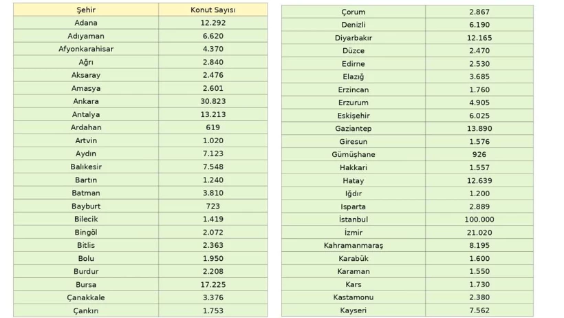 İllerin nüfus yoğunluğu, kira artış oranları ve barınma talebi dikkate alınarak belirlenen rakama göre; en fazla konut, İstanbul'da 100 bin, Ankara'da 30 bin 823, İzmir'de 21 bin 20, Bursa'da 17 bin 225 ve Konya'da 15 bin olarak planlandı.