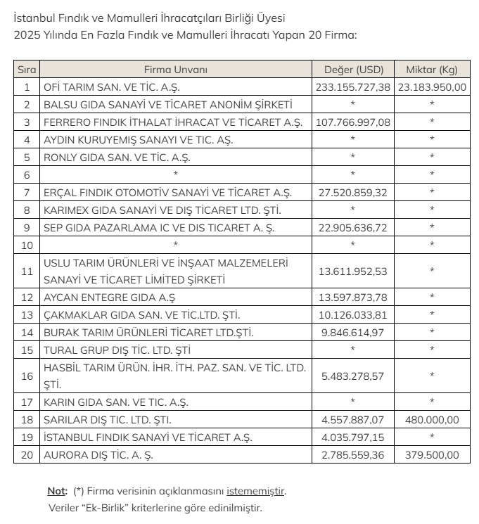 İstanbul Fındık ve Mamulleri İhracatçıları Birliği verilerine göre, 2025 yılında fındık ve fındık mamulleri ihracatında liderlik OFİ Tarım San. ve Tic. A.Ş.’nin oldu. Firma, 233,1 milyon dolarlık ihracat değeri ve 23,1 bin tonun üzerindeki ihracat miktarıyla sektörün açık ara lideri konumuna yükseldi.