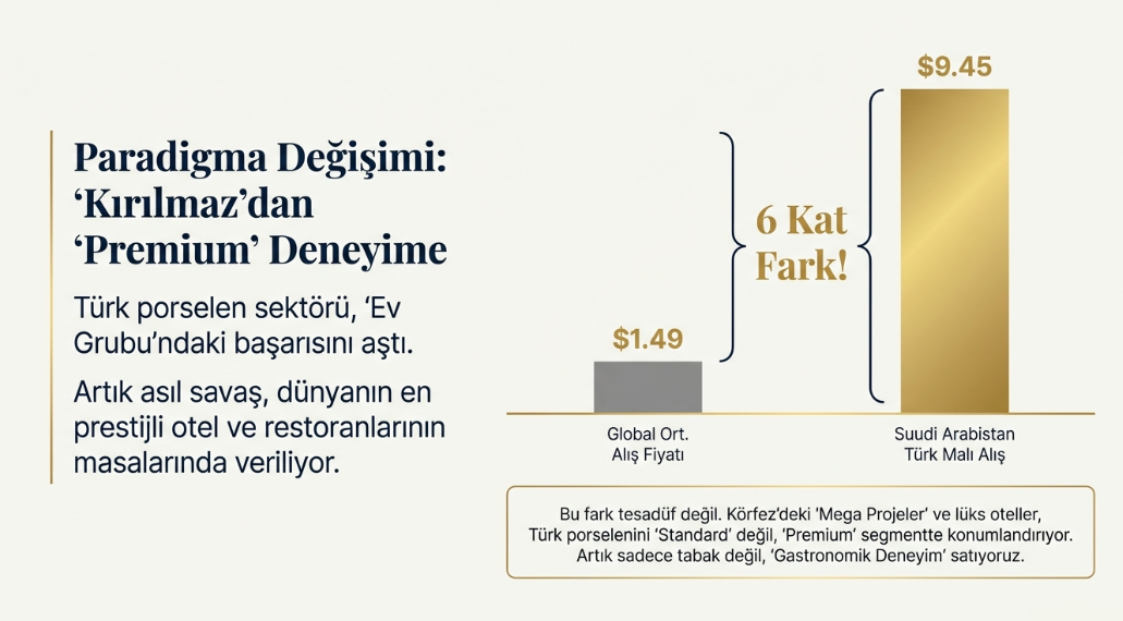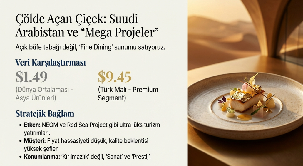 Analiz: Suudi Arabistan'daki NEOM, Red Sea Project gibi ultra lüks turizm yatırımları, Türk porselenini tercih ediyor. Aradaki 6 katlık fiyat farkı, şeflerin ve F&B müdürlerinin Türk tasarımlarını "High-End Sunum" için kullandığını gösteriyor. Biz orada "Kırılmazlık" değil, "Sanat" satıyoruz.