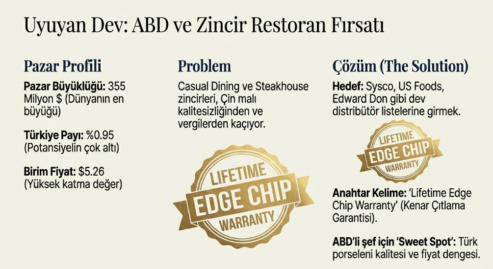 Fırsat: ABD'deki "Casual Dining" ve "Steakhouse" zincirleri, Çin malının kalitesizliğinden ve artan vergilerden kaçıyor. Türk porseleni, Lifetime Edge Chip Warranty (Kenar Çıtlama Garantisi) ve $5.26'lık rekabetçi fiyatıyla, ABD'li şeflerin aradığı o "Sweet Spot" (İdeal Nokta) ürün. Hedefimiz tek tek restoranlar değil, Sysco, US Foods, Edward Don gibi dev Horeca distribütörleri olmalı.
